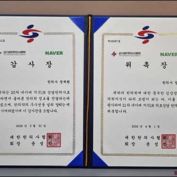 안녕하세요. 도곡동 정원장입니다. 오늘은 진료 이야기가 아닌 작은 소식 하나를 전해드립니다. 2026년 4월 1일자로 21차 네이버 지식iN 의료상담 한의사로 위촉되었습니다. 함께 전달받은 20차 감사장은 지난 1년 동안의 활동에 대한 의미 있는 기록이 되었습니다. 2023년, 2024년, 2025년에 이어 올해까지 4년 연속으로 상담한의사에 선정되었습니다. 지식iN 상담한의사란 네이버 지식iN 플랫폼에서 일반 사용자분들이 올려주시는 건강 관련 질문에 의료 전문가 자격으로 답변하는 역할입니다. 대한한의사협회와 네이버가 공동으로 심사해 1년 단위로 새로 위촉하며, 답변의 정확성과 전문성, 활동량을 종합적으로 평가합니다. 온라인에는 한의…….